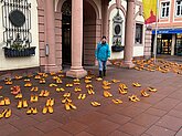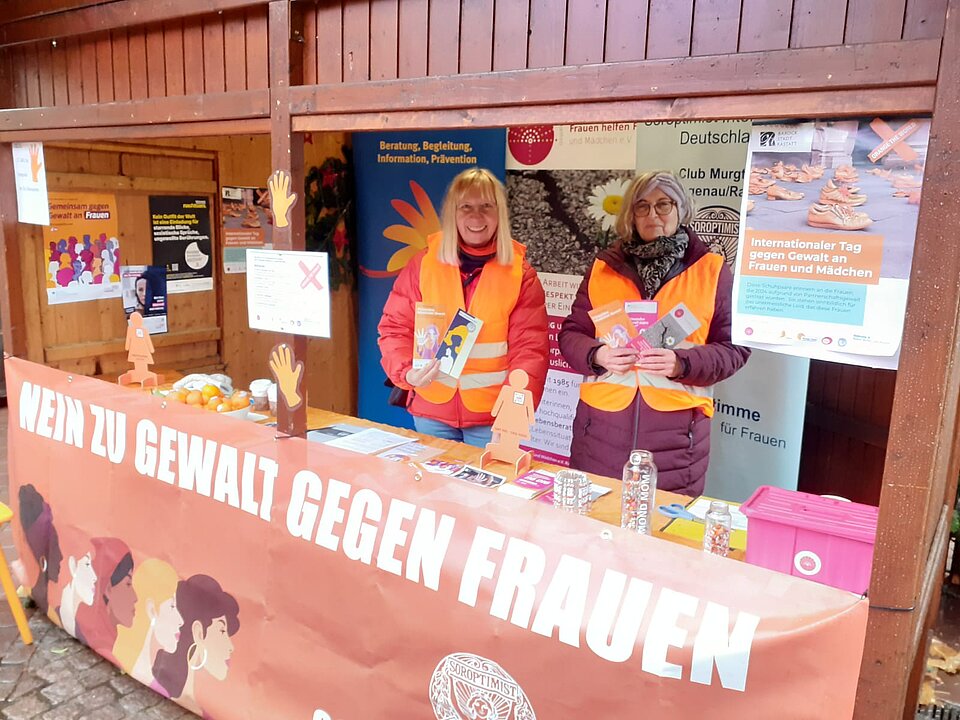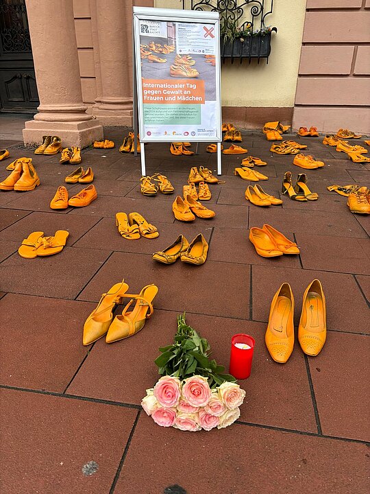 Gemeinsam mit den Rastatter Vereinen Frauen helfen Frauen und Mädchen e.V., Feuervogel und Frauen- und Kinderschutzhaus waren wir mit einem Aktionsstand auf dem Rastatter Weihnachtsmarkt vertreten. Organisiert wurde die Aktion von der Gleichstellungsbeauftragten der Stadt Rastatt und den Frauen der kfd. Neben Flyern mit Hilfsangeboten wurden als sichtbares, orangefarbenes Zeichen Clementinen verteilt, Lesezeichen mit dem Appell SAY NO und Schlüsselanhänger in Form eines Schutzengels gegen eine Spende angeboten. Vor dem historischen Rathaus wurden 124 orange gefärbte Frauenschuhe ausgestellt, jedes Paar stellvertretend für eine durch ihren Partner oder Ex-Partner getötete Frau in Deutschland letztes Jahr. Die Schuhe sorgten bei vielen Passanten für Fragen und die Möglichkeit, über das Thema "Gewalt an Frauen " ins Gespräch zu kommen. Beeindruckend war, dass Passanten Blumen und Grabkerzen bei den Schuhen aufgestellt haben.
